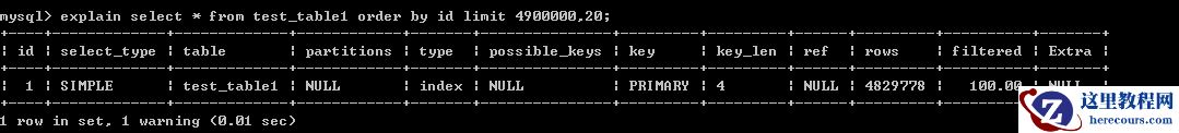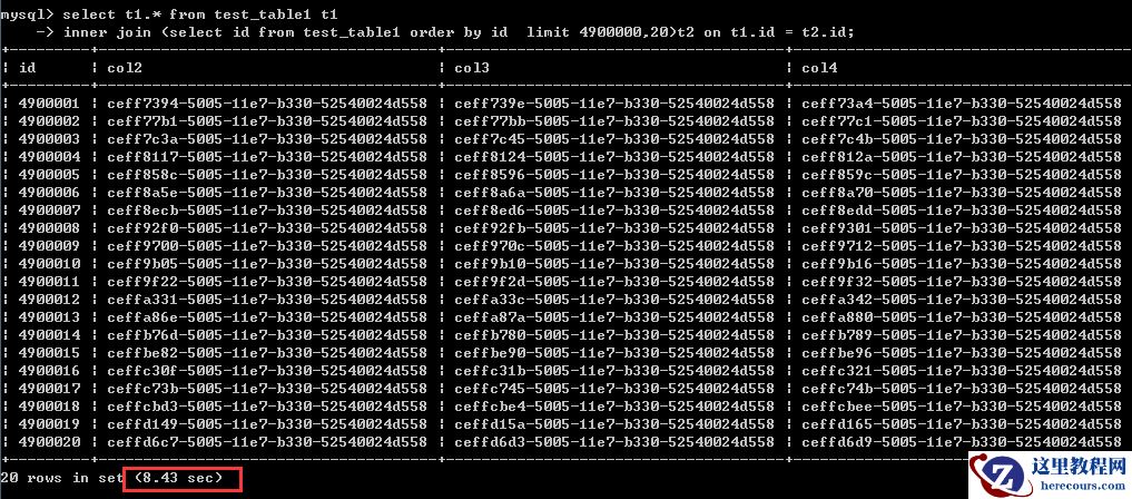 inner join (select id from test_table1 order by id limit 4900000,20)t2 on t1.id = t2.id;执行时间为8.43秒