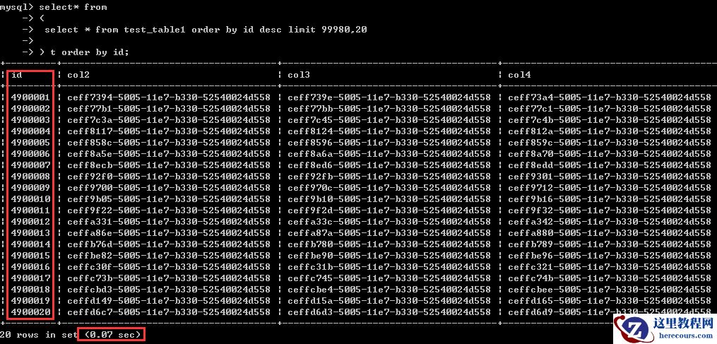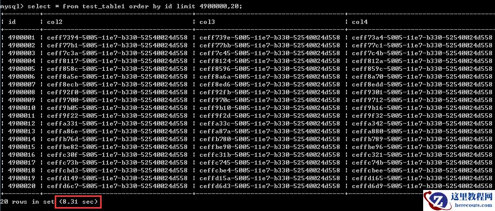 select * from test_table1 order by id asc limit 4900000,20;测试结果见截图,执行时间为8.31秒
