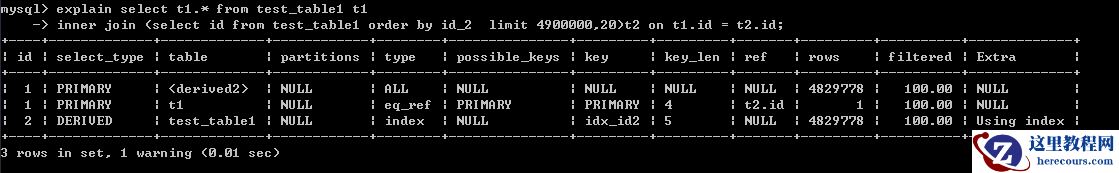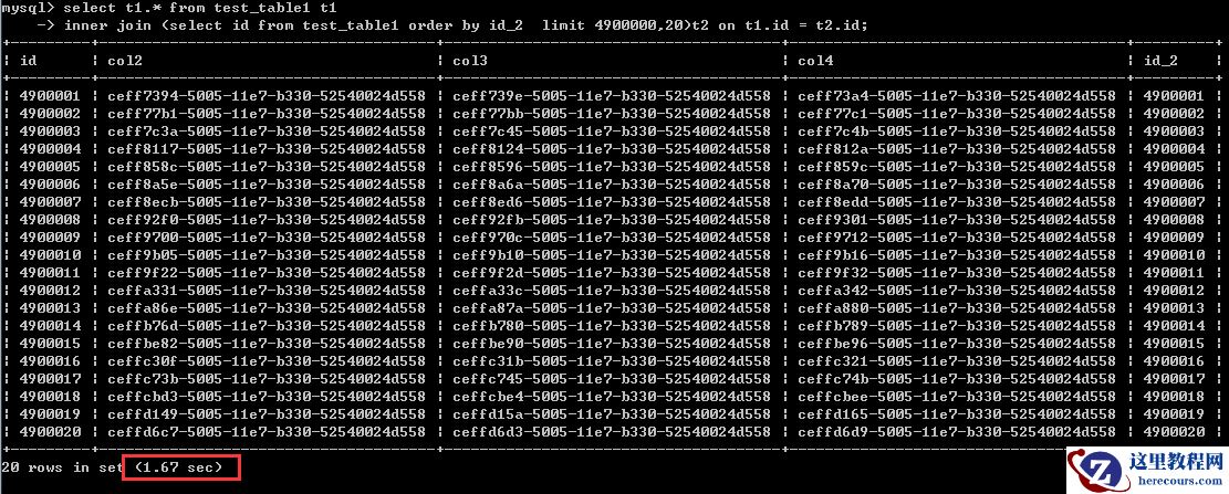 inner join (select id from test_table1 order by id_2 limit 4900000,20)t2 on t1.id = t2.id;执行时间1.67秒