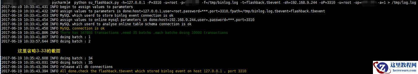 1 --测试环境(请安装pymysql):IP: 192.168.9.242,PORT:3310 ,数据库:flashback,表格:tbevent 2 --具有线上表结构的db:IP:192.168.9.243 PORT:3310 3 4 5 mysql> show global variables like 'max_allowed_packet'; 6 +--------------------+----------+ 7 | Variable_name | Value | 8 +--------------------+----------+ 9 | max_allowed_packet | 16777216 |10 +--------------------+----------+11 1 row in set (0.00 sec)12 13 mysql> set global max_allowed_packet = 1073741824;14 Query OK, 0 rows affected (0.00 sec)15 16 [root@sutest244 ~]# mysqlbinlog --start-datetime='2017-06-19 09:00:00' --stop-datetime='2017-06-19 10:00:00' --base64-output=decode-rows -v ~/data/mysql/data/mysql-bin.007335 > /tmp/binlog.log17 18 [root@sutest242 pycharm]# python su_flashback.py -h=127.0.0.1 -P=3310 -u=root -p=**** -f=/tmp/binlog.log -t=flashback.tbevent -oh=192.168.9.244 -oP=3310 -u=root -op=**** -a=019 2017-06-19 10:59:39,041 INFO begin to assign values to parameters20 2017-06-19 10:59:39,041 INFO assign values to parameters is done:host=127.0.0.1,user=root,password=***,port=3310,fpath=/tmp/binlog.log,tbevent=flashback.tbevent21 2017-06-19 10:59:39,049 INFO MySQL which userd to store binlog event connection is ok22 2017-06-19 10:59:39,050 INFO assign values to online mysql parameters is done:host=192.168.9.244,user=,password=***,port=331023 2017-06-19 10:59:39,054 INFO MySQL which userd to analyse online table schema connection is ok24 2017-06-19 10:59:39,054 INFO MySQL connection is ok25 2017-06-19 10:59:39,055 INFO creating table flashback.tbevent to store binlog event26 2017-06-19 10:59:39,058 INFO created table flashback.tbevent 27 2017-06-19 10:59:39,060 INFO begining to analyze the binlog file ,this may be take a long time !!!28 2017-06-19 10:59:39,061 INFO analyzing...29 2017-06-19 11:49:53,781 INFO finished to analyze the binlog file !!!30 2017-06-19 11:49:53,782 INFO release all db connections31 2017-06-19 11:49:53,782 INFO All done,check the flashback.tbevent which stored binlog event on host 127.0.0.1 , port 3310 32 33 34 [root@sutest242 pycharm]# python su_flashback.py -h=127.0.0.1 -P=3310 -u=root -p=**** -f=/tmp/binlog.log -t=flashback.tbevent -oh=192.168.9.244 -oP=3310 -u=root -op=**** -a=135 2017-06-19 16:30:20,633 INFO begin to assign values to parameters36 2017-06-19 16:30:20,635 INFO assign values to parameters is done:host=127.0.0.1,user=root,password=***,port=3310,fpath=/tmp/binlog.log,tbevent=flashback.tbevent37 2017-06-19 16:30:20,865 INFO MySQL which userd to store binlog event connection is ok38 2017-06-19 16:30:20,866 INFO assign values to online mysql parameters is done:host=192.168.9.244,user=,password=***,port=331039 2017-06-19 16:30:20,871 INFO MySQL which userd to analyse online table schema connection is ok40 2017-06-19 16:30:20,871 INFO MySQL connection is ok41 2017-06-19 16:30:21,243 INFO There has 347868 transactions ,need 35 batchs ,each batche doing 10000 transactions 42 2017-06-19 16:30:21,243 INFO doing batch : 1 43 2017-06-19 16:31:01,182 INFO doing batch : 2 44 2017-06-19 16:31:16,909 INFO doing batch : 3 45 -------省空间忽略不截图--------------46 2017-06-19 16:41:11,287 INFO doing batch : 34 47 2017-06-19 16:41:25,577 INFO doing batch : 35 48 2017-06-19 16:41:44,629 INFO release all db connections49 2017-06-19 16:41:44,630 INFO All done,check the flashback.tbevent which stored binlog event on host 127.0.0.1 , port 3310