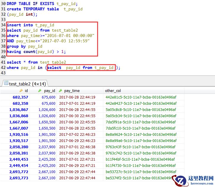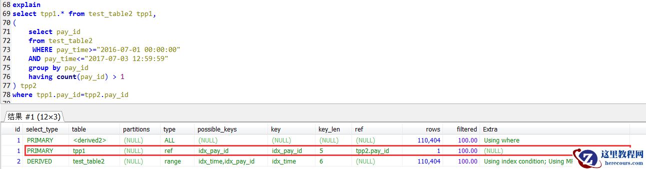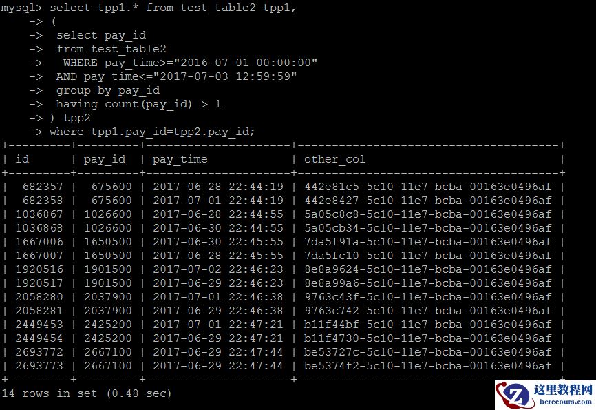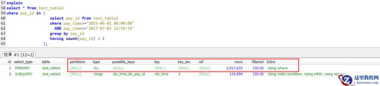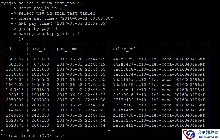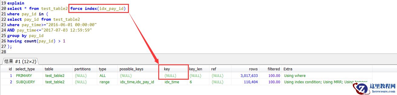 select * from test_table2 force index(idx_pay_id)where pay_id in ( select pay_id from test_table2 where pay_time>="2016-06-01 00:00:00" AND pay_time<="2017-07-03 12:59:59" group by pay_id having count(pay_id) > 1);
