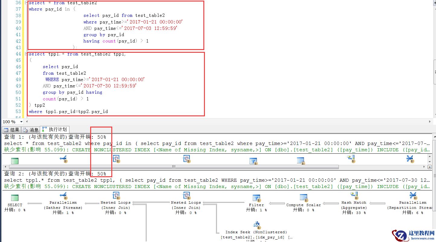 下面是类似案例在sqlserver 2014中的测试,几万完全一样的测试表结构和数量,可见这种情况下,两种写法,在SQL Server中可以认为是完全一样的(执行计划+效率),这一点SQL Server要比MySQL强不少