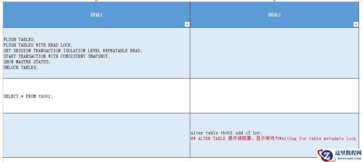 场景2:mysqldump开始备份并完成tb001的导出,在对其他表进行导出过程中,其他回话对表进行alter操作