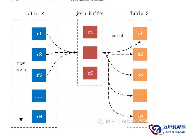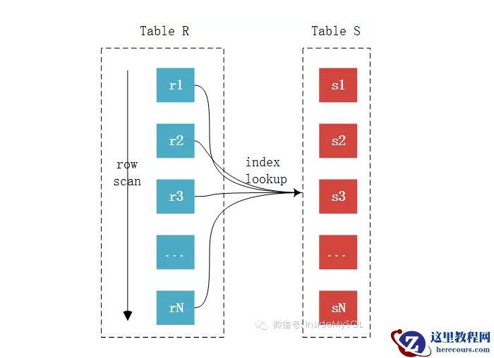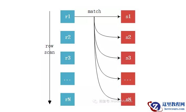 这个算法相对来说就是很简单了,从驱动表中取出R1匹配S表所有列,然后R2,R3,直到将R表中的所有数据匹配完,然后合并数据,可以看到这种算法要对S表进行RN次访问,虽然简单,但是相对来说开销还是太大了