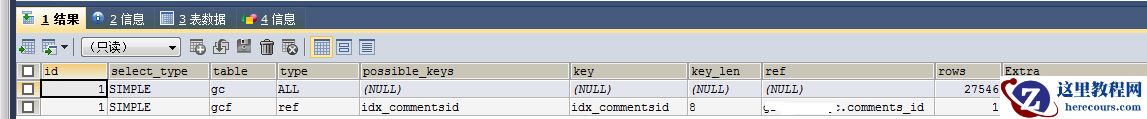 表comments_for,总行数57,comments_id是有索引的,ID列为主键。
