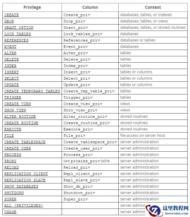 用户详情的权限列表请参考MySQL官网说明:http://dev.mysql.com/doc/refman/5.7/en/privileges-provided.html
