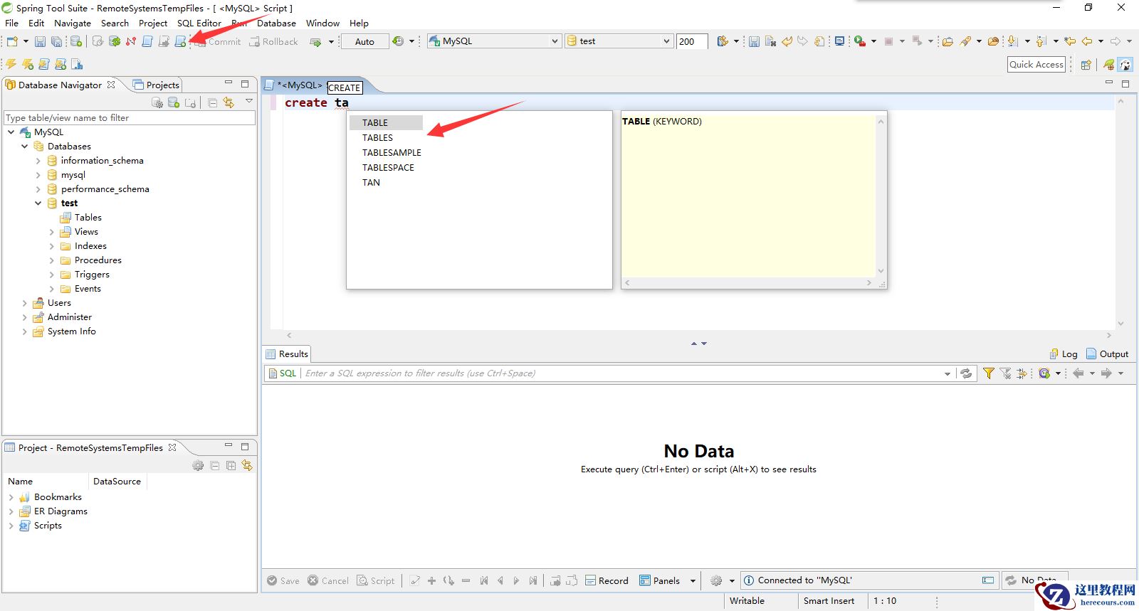 可以切换到数据库操作视图下进行操作