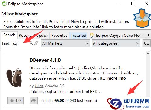 输入sql进行查找,就可以看到DBeaver了,点击Install按钮根据提示安装就好啦