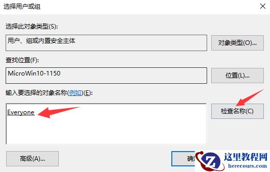 6)在弹出的窗口中,输入every,点击"检查名称",会找到"Everyone"