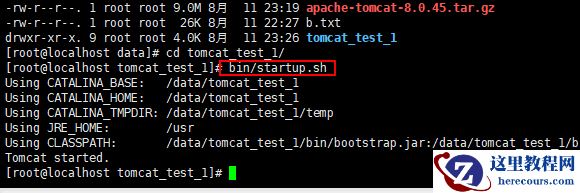 当然你也可以选择修改 Tomcat 的名字,命令:mv(此处有空格)apache-tomcat-8.0.45(此处也有空格)tomcat_test_1
