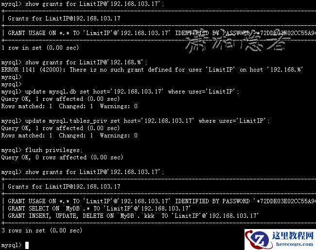 mysql> select user, host from mysql.user where user='LimitIP'; +---------+-----------+ | user | host | +---------+-----------+ | LimitIP | 192.168.% | +---------+-----------+ 1 row in set (0.00 sec) mysql> update mysql.user set host='192.168.103.17' where user='LimitIP'; Query OK, 1 row affected (0.02 sec) Rows matched: 1 Changed: 1 Warnings: 0 mysql> flush privileges; Query OK, 0 rows affected (0.01 sec) mysql> select user, host from user where user='LimitIP'; ERROR 1046 (3D000): No database selected mysql> use mysql; Reading table information for completion of table and column names You can turn off this feature to get a quicker startup with -A Database changed mysql> select user, host from user where user='LimitIP'; +---------+----------------+ | user | host | +---------+----------------+ | LimitIP | 192.168.103.17 | +---------+----------------+ 1 row in set (0.00 sec) mysql> show grants for LimitIP@'192.168.103.17'; +---------------------------------------------------------------------------------------------------------------------+ | Grants for LimitIP@192.168.103.17 | +---------------------------------------------------------------------------------------------------------------------+ | GRANT USAGE ON *.* TO 'LimitIP'@'192.168.103.17' IDENTIFIED BY PASSWORD '*72DDE03E02CC55A9478A82F3F4EBE7F639249DEC' | +---------------------------------------------------------------------------------------------------------------------+ 1 row in set (0.00 sec) mysql>