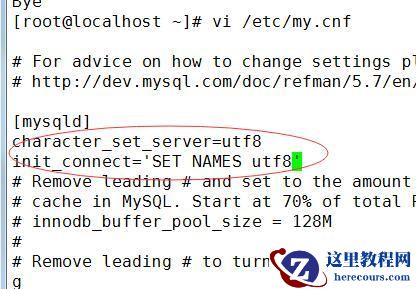 [mysqld] character_set_server=utf8 init_connect='SET NAMES utf8' [root@localhost ~]# vi /etc/my.cnf