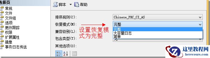 以及在数据库属性,选项设置中,设置为完整备份,具体如下图