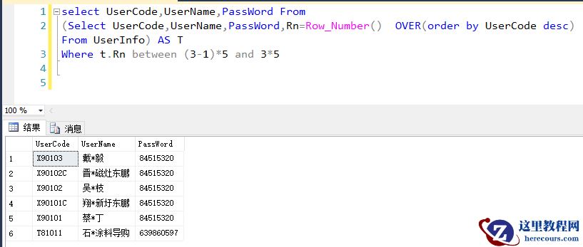 (Select UserCode,UserName,PassWord,Rn=Row_Number() OVER(order by UserCode desc) From UserInfo) AS T