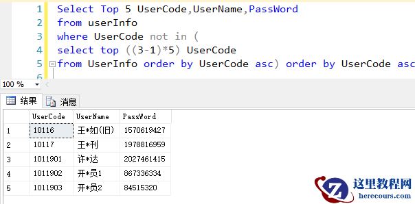 方法1:利用select top配合not in(或者not exists),查询第n页的时候,过滤掉n-1页的数据即可,示例假设每页查询数量为5,查询第3页的数据;