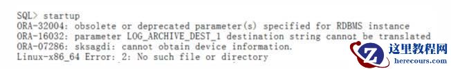 SQL> startup nomount; ORA-32004: obsolete or deprecated parameter(s) specified for RDBMS instance ORA-16032: parameter LOG_ARCHIVE_DEST destination string cannot be translated ORA-07286: sksagdi: cannot obtain device information. Linux-x86_64 Error: 2: No such file or directory