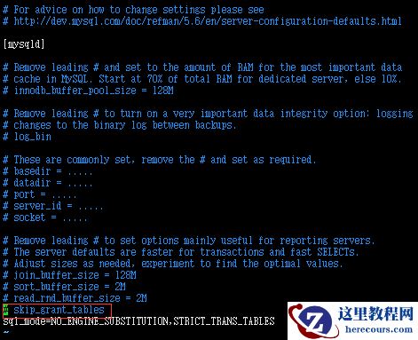 再进入vim编辑模式,即按下insert,在下图指定位置添加 skip_grant_tables,如下图所示