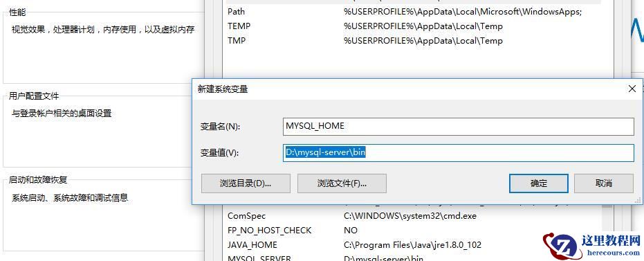 变量名可以根据喜好随便取,我这里叫做MYSQL_HOME,变量值是你刚刚下载的mysql文件夹所在的目录,我们指向其中的bin目录,然后一路确定返回