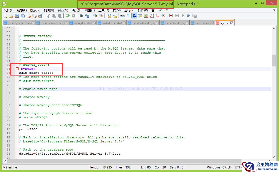 然后,打开文件,在mysqld下,添加一句代码 skip-grant-tables ,以跳过权限的审核。
