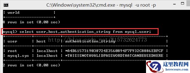 然后,我们再看看mysql.user表里都有啥。 select user,host,authentication_string from mysql.user