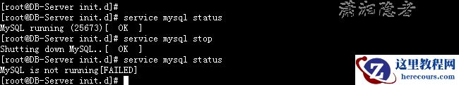 [root@DB-Server init.d]# service mysql status MySQL running (25673)[ OK ] [root@DB-Server init.d]# service mysql stop Shutting down MySQL..[ OK ] [root@DB-Server init.d]# service mysql status MySQL is not running[FAILED]