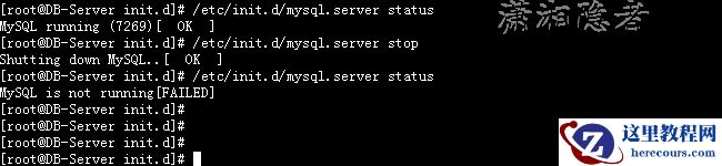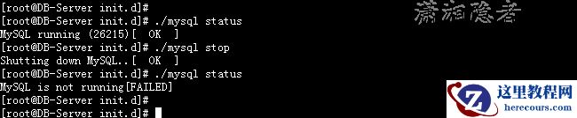 [root@DB-Server init.d]# ./mysql status MySQL running (26215)[ OK ] [root@DB-Server init.d]# ./mysql stop Shutting down MySQL..[ OK ] [root@DB-Server init.d]# ./mysql status MySQL is not running[FAILED] [root@DB-Server init.d]#