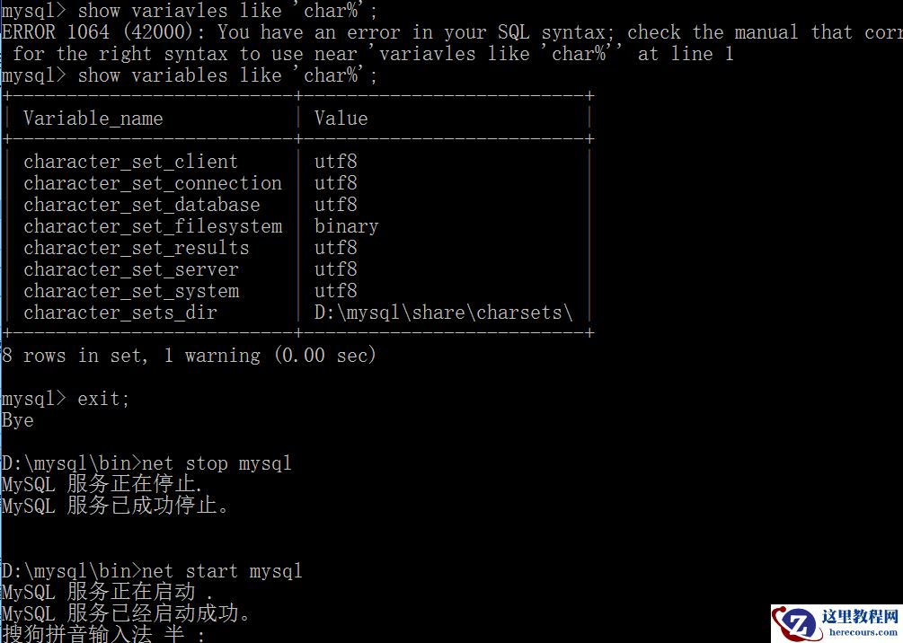 修改字符集首先进入mysql: mysql -uroot (用户登录,因为初始化选了没密码的那种),show variables like 'char%' (查看字符编码),如图: