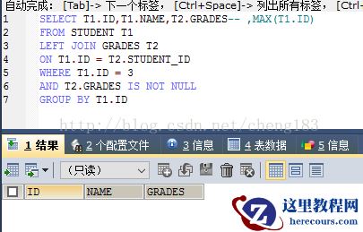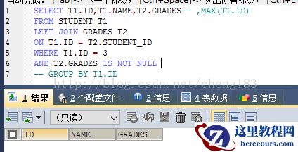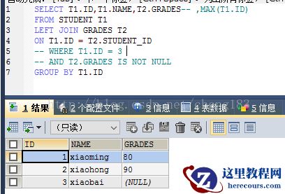 CREATE TABLE `grades` ( `id` int(20) NOT NULL AUTO_INCREMENT, `student_id` int(20) NOT NULL, `subject` varchar(20) COLLATE utf8_bin DEFAULT NULL, `grades` varchar(20) COLLATE utf8_bin DEFAULT NULL, PRIMARY KEY (`id`) ) ENGINE=InnoDB AUTO_INCREMENT=4 DEFAULT CHARSET=utf8 COLLATE=utf8_bin; insert into `grades`(`id`,`student_id`,`subject`,`grades`) values (1,1,'语文','80'),(2,1,'数学','89'),(3,2,'语文','90'); CREATE TABLE `student` ( `id` int(20) NOT NULL AUTO_INCREMENT, `name` varchar(20) COLLATE utf8_bin DEFAULT NULL, PRIMARY KEY (`id`) ) ENGINE=InnoDB AUTO_INCREMENT=4 DEFAULT CHARSET=utf8 COLLATE=utf8_bin; insert into `student`(`id`,`name`) values (1,'xiaoming'),(2,'xiaohong'),(3,'xiaobai');