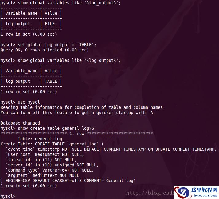 show global variables like '%log_output%'; set global log_output = 'TABLE'; use mysql; show create table general_log\G