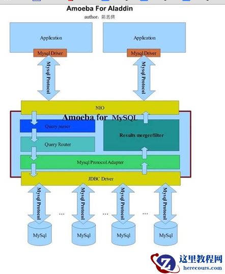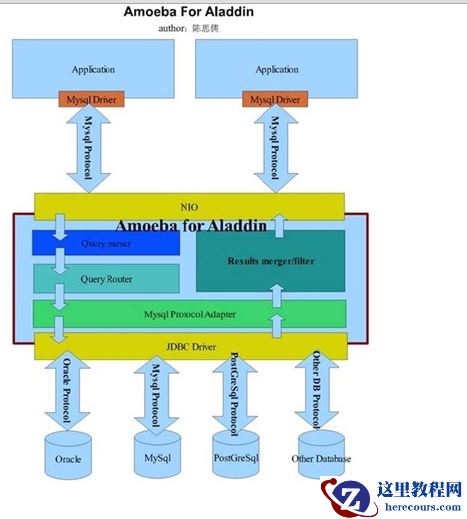 他能够同一时候连接不同数据库的数据源为前端应用程序提供服务,可是仅仅接受符合MySQL协议的client应用程序请求。也就是说,仅仅要前端应用程序通过MySQL协议连接上来之后,AmoebaForAladin会自己主动分析Query语句,依据Query语句中所请求的数据来自己主动识别出该所Query的数据源是在什么类型数据库的哪一个物理主机上面。下图展示了AmoebaForAladin的架构细节(出自Amoeba开发人员博客):