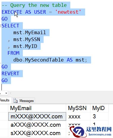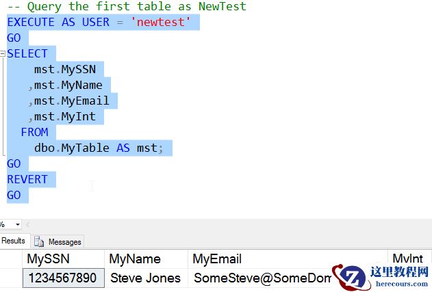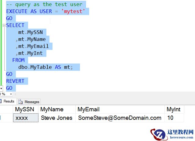( '1234567890', 'Steve Jones', 'SomeSteve@SomeDomain.com', 10 )如果创建者查询这个表,就会看到一个普通的表。我得到所有的数据,当它被插入时。这是因为我是一个有权限的用户。同理那些具有dbo特权(db_owner或sysadmin角色)的用户将不会看到屏蔽数据。现在创建一个正常的用户没有高权限的用户。当然,我需要授予普通的SQL Server权限来查看表中的数据。