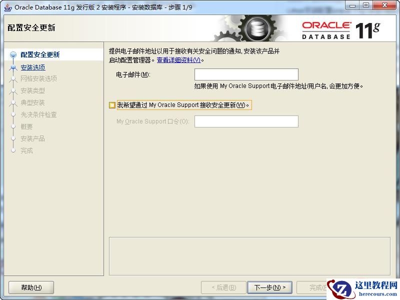 第二步:配置安全更新:本步可将自己的电子邮件地址填写进去(也可以不填写,只是收到一些没什么用的邮件)。取消下面的“我希望通过My Oracle Support接受安全更新(W)”。