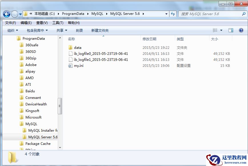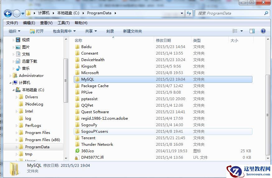 4、删除C盘下的“C:\ProgramData\MySQL ”所有文件,如果删除不了则用360粉碎掉即可,该programData文件是隐藏的默认,设置显示后即可见,或者直接复制上边的地址到地址栏回车即可进入!删除后重启电脑,重装MYsql数据库应该就成功了。