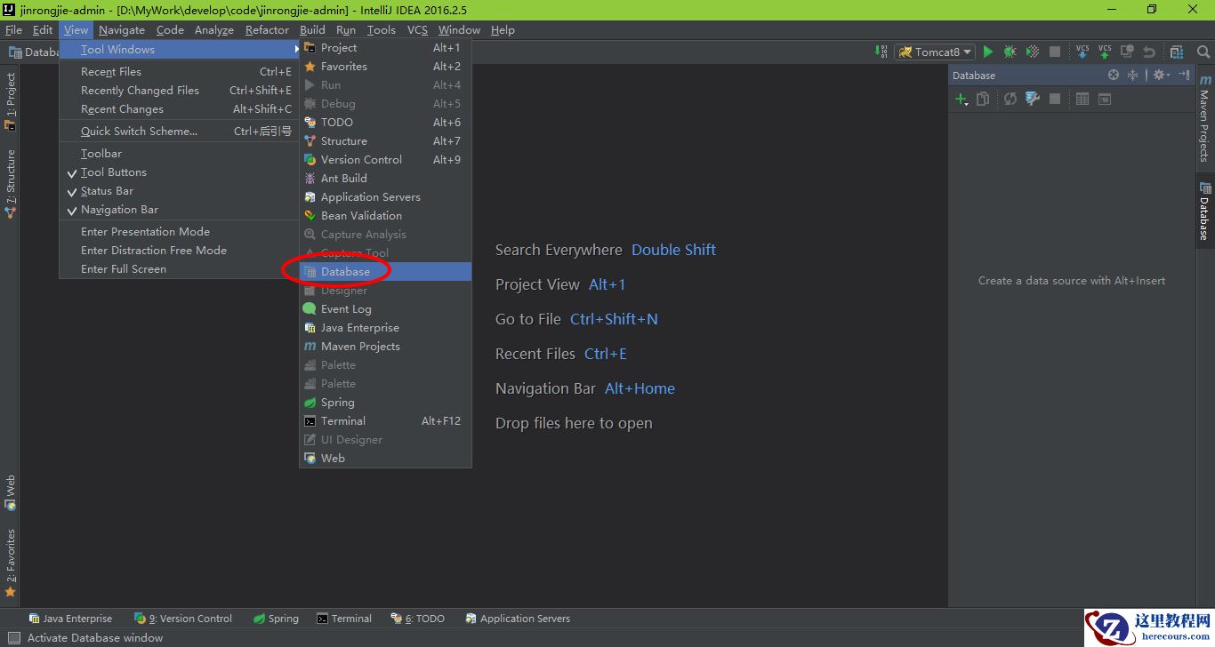 1、从菜单View→Tool Windows→Database打开数据库工具窗口,如下图所示: