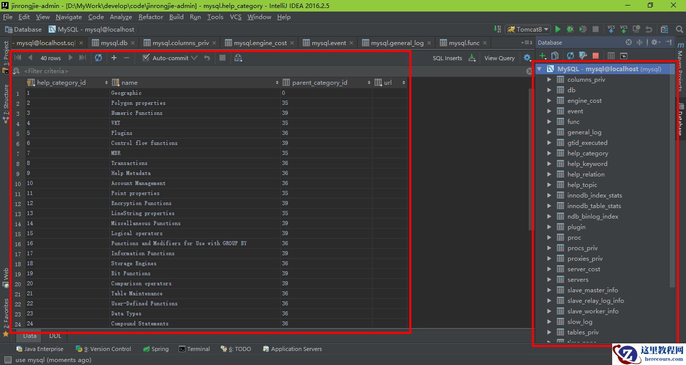 连接数据库成功后即可在右侧红框所示窗口内查看当前连接数据库的数据表,左侧红框为选中表的数据,如下图所示: