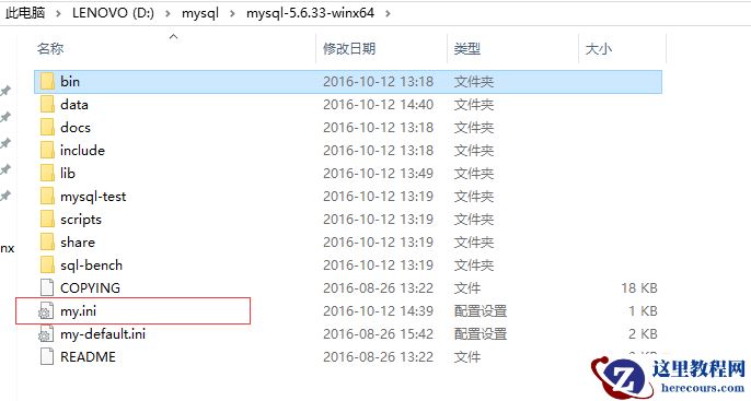 在D:\mysql\mysql-5.6.33-winx64\(注意这个目录要和你自己的目录,我这里下载的是5.6版本,要是你下载的是5.5版本,这个目录是不一样的)目录下新建一个配置文件,文件名叫my.ini,然后把下面的配置代码复制到在my.ini(代码中的路径要改成自己的文件存放路径)。如图: