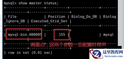 change master to master_user='Slave',master_password='123456',master_host='192.168.43.201',master_log_file='mysql-bin.000005',master_log_pos=155,get_master_public_key=1; #注意,这里的master_log_file,就是binlog的文件名,输入上图中的mysql-bin.000005,每个人的都可能不一样。 #注意,这里的master_log_pos是binlog偏移量,输入上图中的155,每个人的都可能不一样。
