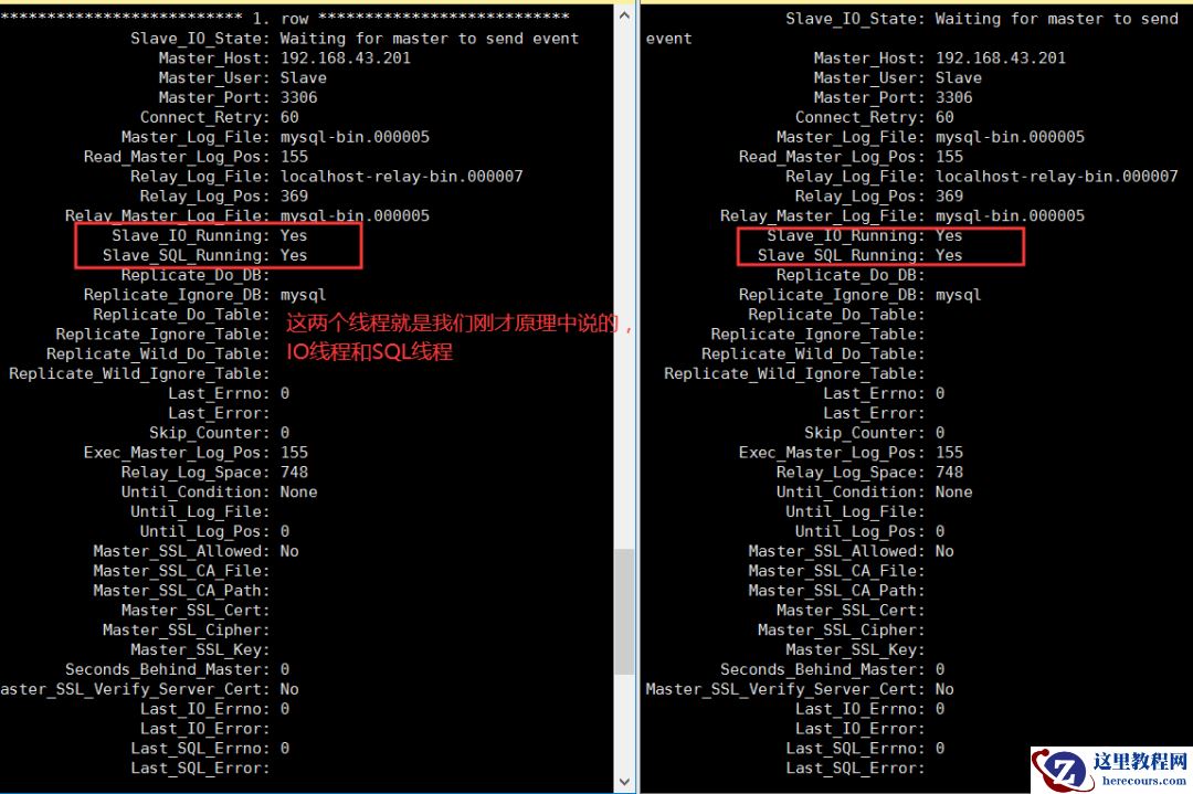 可以看到,在两台Slave的状态中,我们能亲眼看到IO线程和SQL线程的运行状态,这两个线程必须都是yes,才算配置搭建完成。