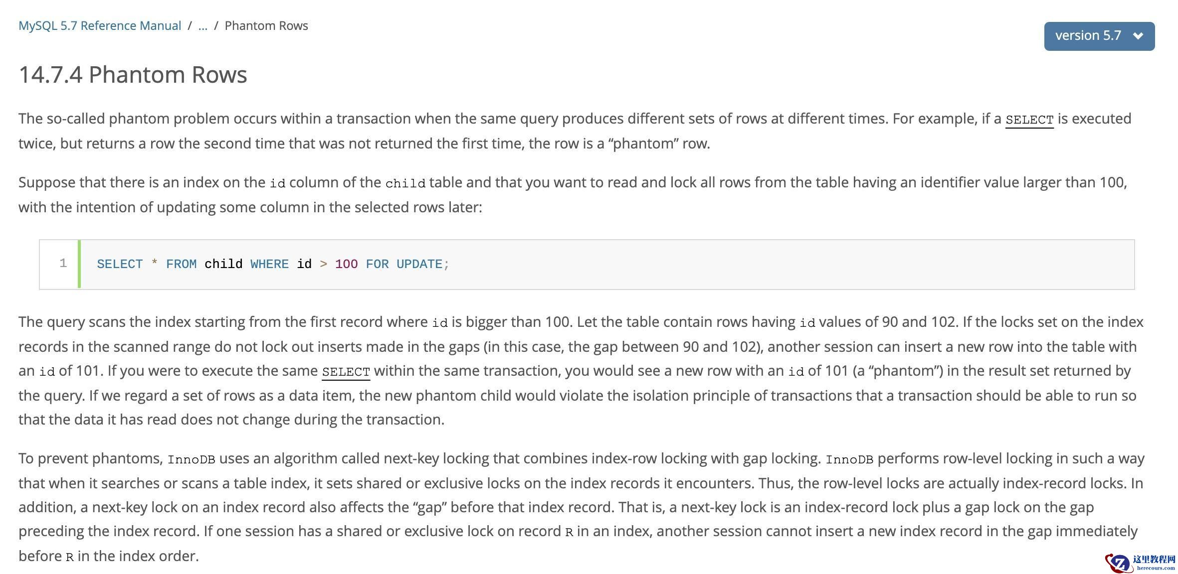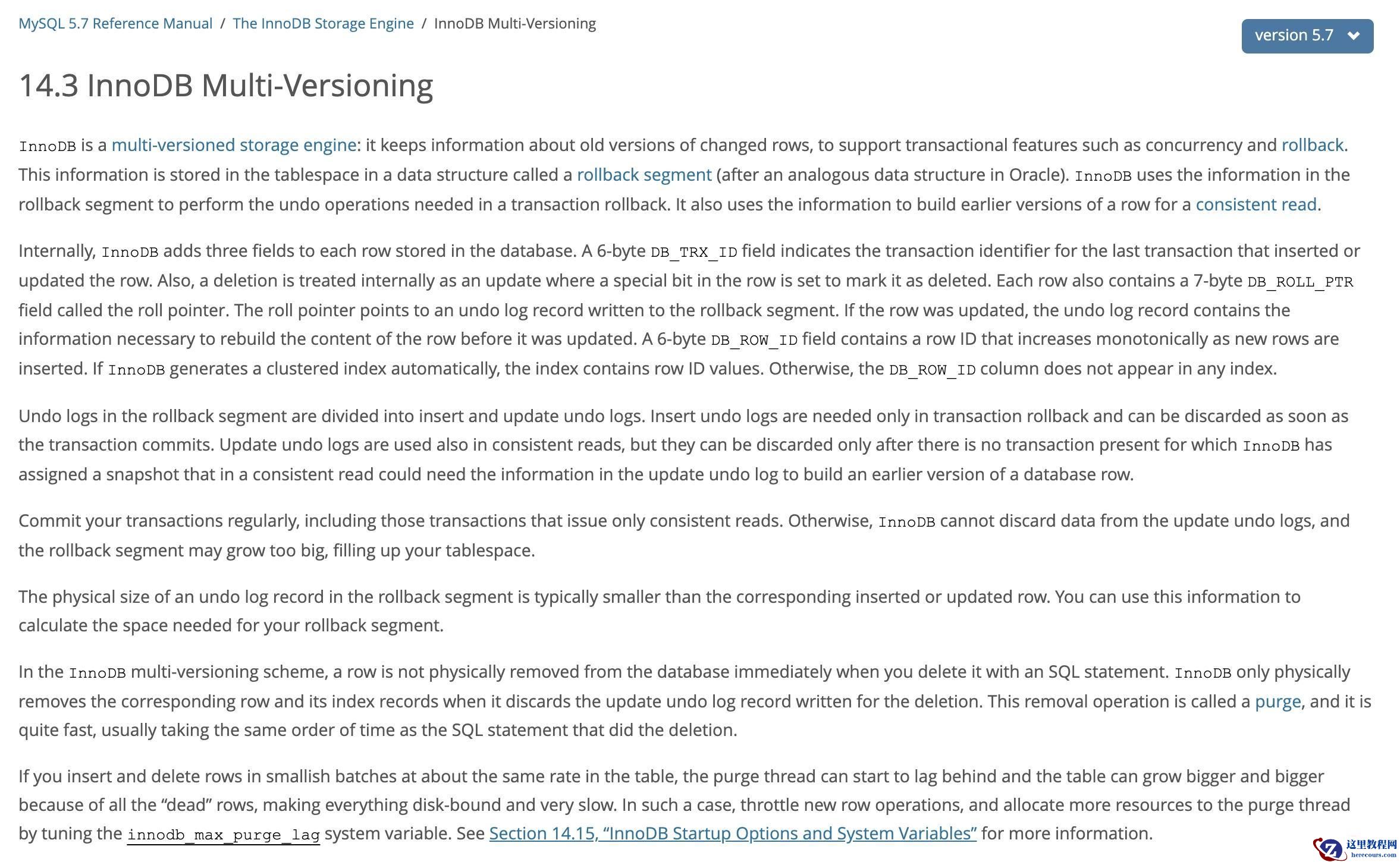 首先看下 MySQL 的官方文档,我对比了 5.1、5.6、5.7 三个版本的 文档[1] ,对 MVCC 这部分的描述,几乎是相同的。