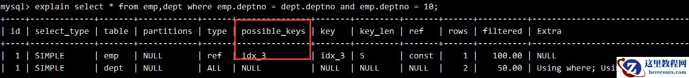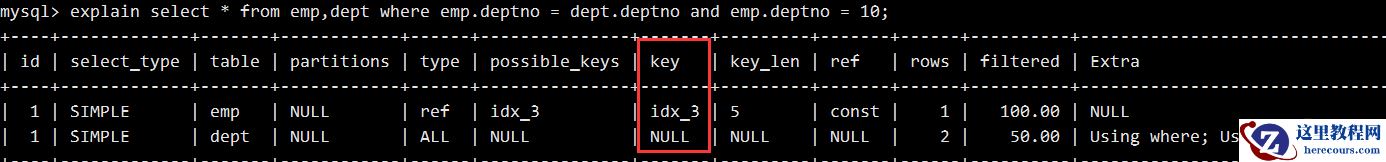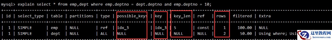 mysql> explain select * from emp where id = 1; +----+-------------+-------+------------+-------+---------------+---------+---------+-------+------+----------+-------+| id | select_type | table | partitions | type | possible_keys | key | key_len | ref | rows | filtered | Extra | +----+-------------+-------+------------+-------+---------------+---------+---------+-------+------+----------+-------+| 1 | SIMPLE | emp | NULL | const | PRIMARY | PRIMARY | 4 | const | 1 | 100.00 | NULL | +----+-------------+-------+------------+-------+---------------+---------+---------+-------+------+----------+-------+复制代码