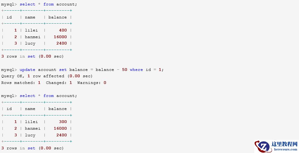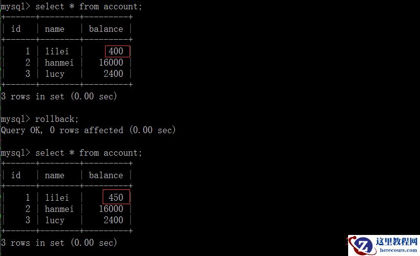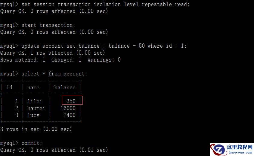 (5)在客户端A执行更新语句update account set balance = balance - 50 where id =1,lilei的balance没有变成350,居然是400,是不是很奇怪,数据不一致啊,如果你这么想就太天真 了,在应用程序中,我们会用400-50=350,并不知道其他会话回滚了,要想解决这个问题可以采用读已提交的隔离级别