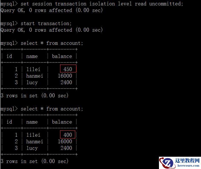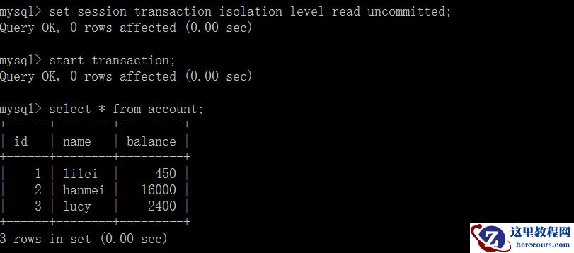 (1)打开一个客户端A,并设置当前事务模式为read uncommitted(未提交读取),查询表account的初始值:
