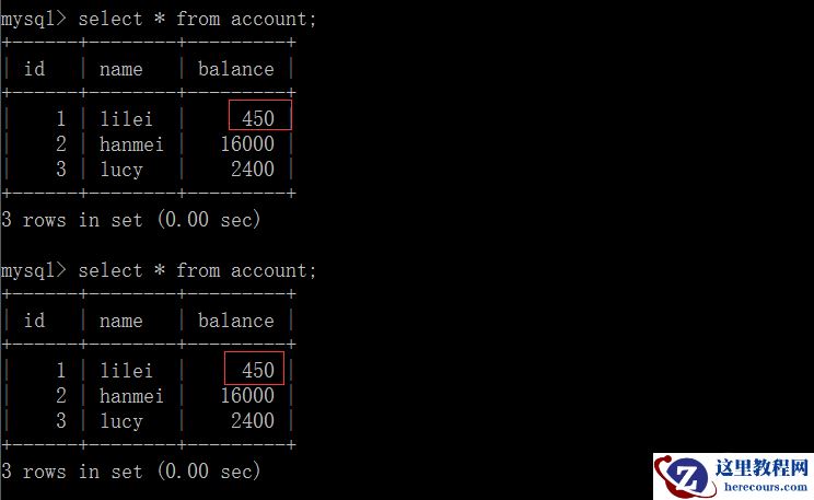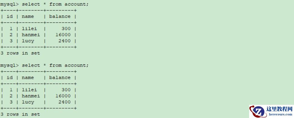 (3)在客户端A查询表account的所有记录,与步骤(1)查询结果一致,没有出现不可重复读的问题
