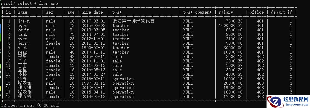 select post,count(post_comment) from emp group by post;在统计分组内个数的时候 填写任意非空字段都可以完成计数,推荐使用能够唯一标识数据的字段 比如id字段