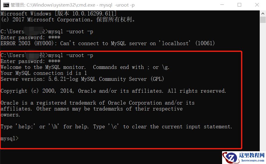 打开 DOS 窗口,输入 mysql 连接命令时,提示报错 Cannot connect to MySQL server on 'localhost' (10061),如下图: