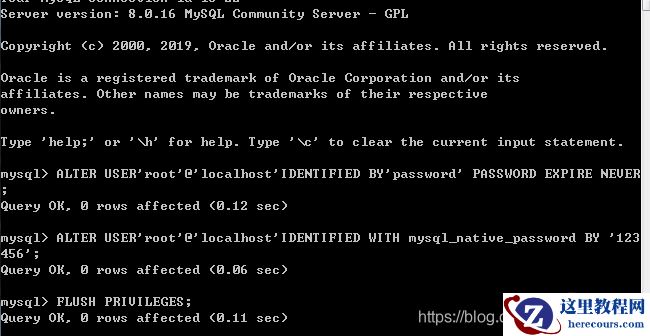 ALTER USER 'root'@'localhost' IDENTIFIED BY 'password' PASSWORD EXPIRE NEVER; #修改加密规则 ALTER USER 'root'@'localhost' IDENTIFIED WITH mysql_native_password BY 'password'; #更新一下用户的密码 FLUSH PRIVILEGES; #刷新权限