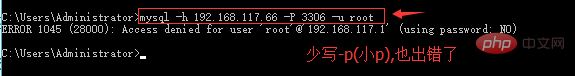 mysql -h 192.168.117.66 -P 3306 -u root注意:少写-p(小p),这种写法也出错了,如下图: