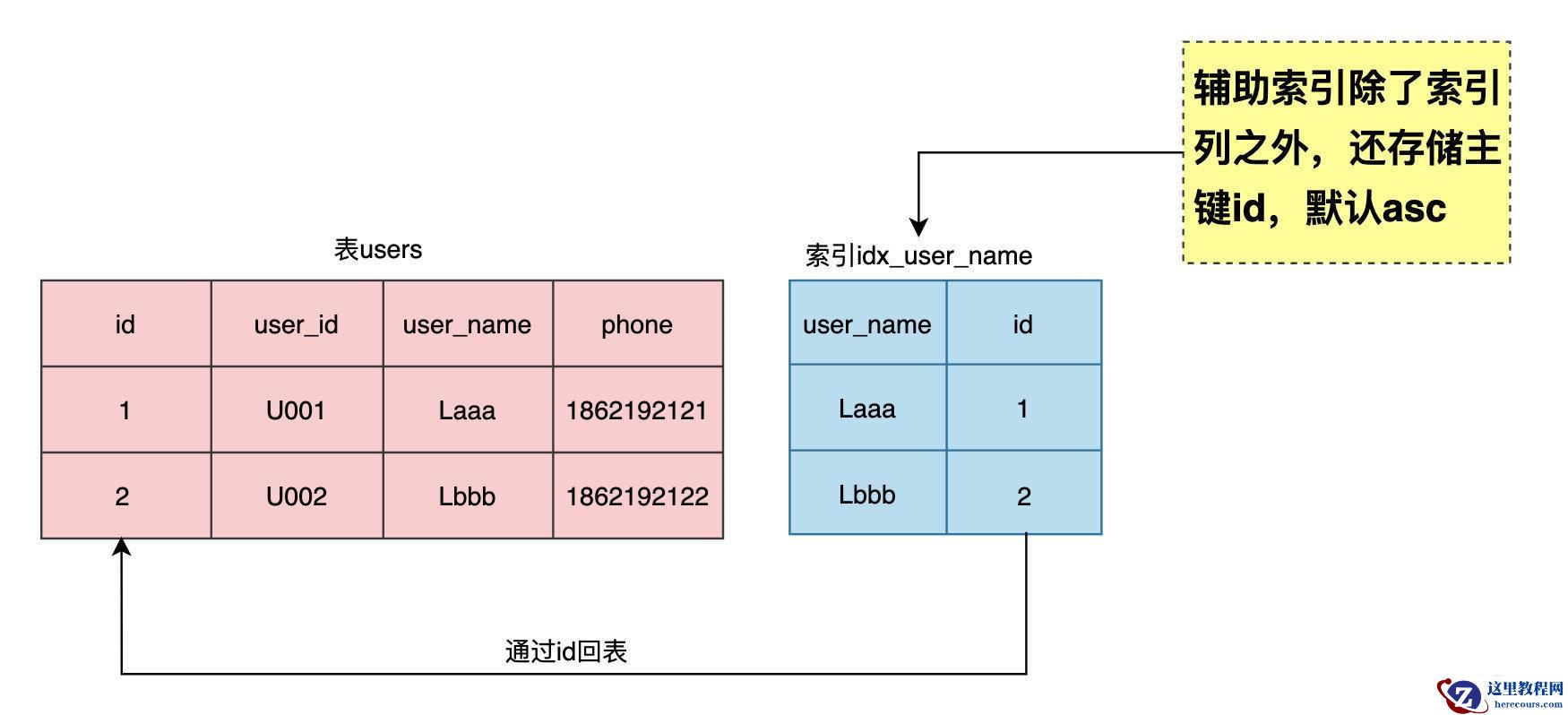 将Section 2的操作称为回表,即通过辅助索引中的主键id去原表中查找数据。