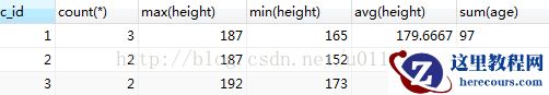 selectc_id,count(*),max(height),min(height),avg(height),sum(age) from my_studentgroup by c_id ;
