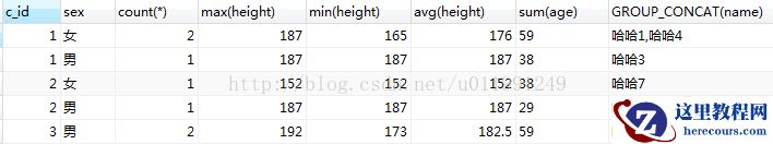 selectc_id,sex,count(*),max(height),min(height),avg(height),sum(age) ,GROUP_CONCAT(name)from my_student group by c_id ,sex;